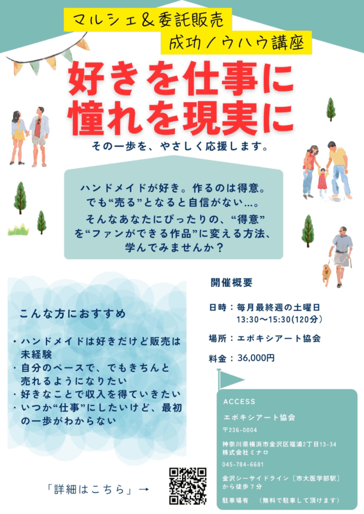 マルシェ出店や委託販売をやってみたいけど、「何を準備すればいいの?」「ディスプレイのコツは?」「委託先ってどう探すの?」 そんな疑問や不安をスッキリ解決できる講座をご用意しました!